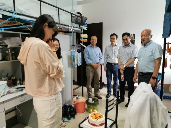 9月2日上午,自动化学院党委书记刘建成、院长江驹、党委副书记张跃、副院长王晓琳、副院长宋晓峰,来到迎新现场指导工作,了解迎新工作的进展情况、新生报到的注册情况。学院领导走进学生宿舍,亲切慰问学生,还为报到期间过生日的新生准备了生日蛋糕,为新生送上生日祝福,让学生步入大学的这个夏天意义非凡且格外特别。