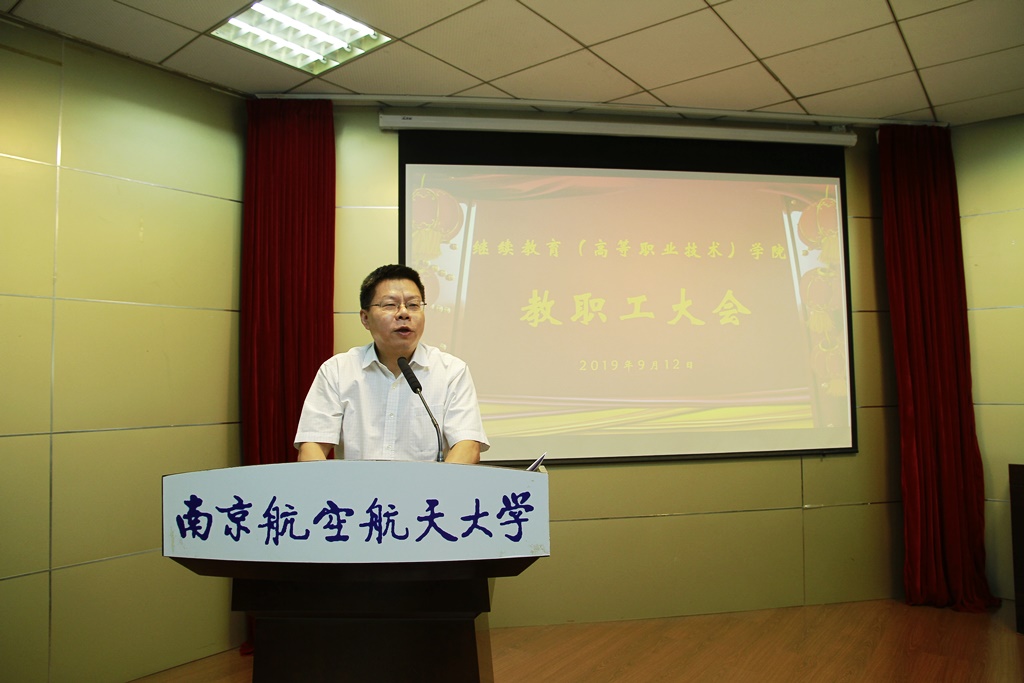 9月12日下午,继续教育学院在12号楼报告厅召开全院教职工大会,学习传达学校七届五次教职工代表大会和2019年下半年干部教师大会精神,并结合学院年度工作目标及上半年各项工作的进展情况,对下半年工作进行了安排部署。院党委书记高斌主持会议。