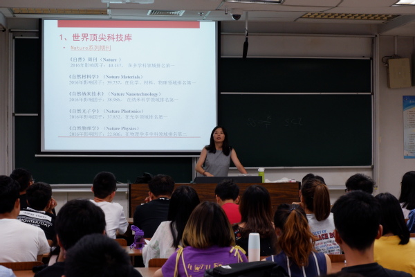 活动伊始,陈长华以“照片泄密案”为例,阐述了信息检索、获取及利用能力在当今社会的重要性。接着,她通过问答的形式介绍了我校图书馆现有数据库资源数目、种类以及科技文献的组成和分类,并从研究角色、信息资源、检索技术、信息利用等方面进行了细致的讲解,列举了国内外常用的数据库,重点介绍其中的顶尖科技库。除此之外,还通过电脑实务操作展示了如何准确高效地查找中外文献等检索技巧。