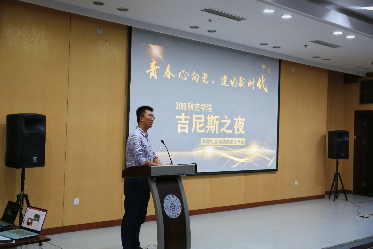 9月26日下午,航空学院在将军路校区图书馆一楼报告厅成功举办2019年暑期社会实践成果分享会暨“吉尼斯之夜”颁奖会。校团委副书记赵铮、航空学院党委副书记许静、校团委吕晶淼、院团委书记韩楚、辅导员宗思雨、吴静文、张小斐、焦安康等老师到场担任评委,航空学院全体大一新生、长空学院新生代表参与了本次活动。
