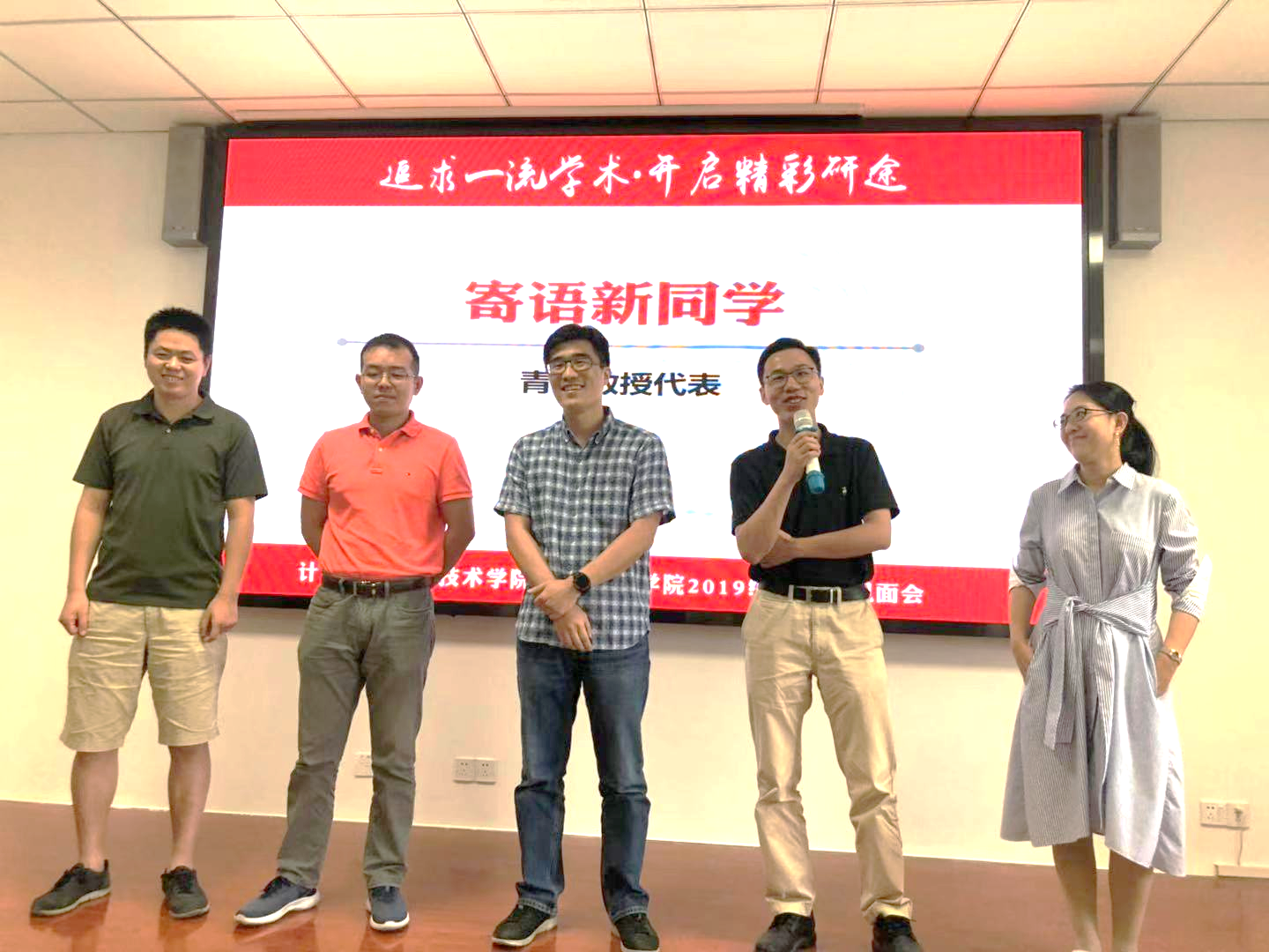 学院“五所一中心”负责人代表、数据管理与知识工程研究所所长秦小麟为新生致欢迎辞,他对新生的到来表示热烈的欢迎,希望每位学生能够将自己个人的发展同学院的发展联系起来,共同为创造学院的美好明天努力。学院青年教授代表黄圣君、张立言、朱琨、韩皓、易畅言共同登台,依次寄语新生。他们在寄语中分享了对于科研、研究生学习等方面的理解,并给新生提出了很多有益的建议,为新生树立了学习的榜样。第十届“良师益友——我最喜爱的导师”许建秋作为导师代表讲话,他围绕资源使用、潜力挖掘、素质培养三个方面,结合所带学生的真实案例对研究生提出了建议。最后,2019级研究生代表陶略发言,他希望同学们都能认真对待研究生生涯,尽快适应计算机研究的快节奏,并呼吁大家多运动、保持健康。