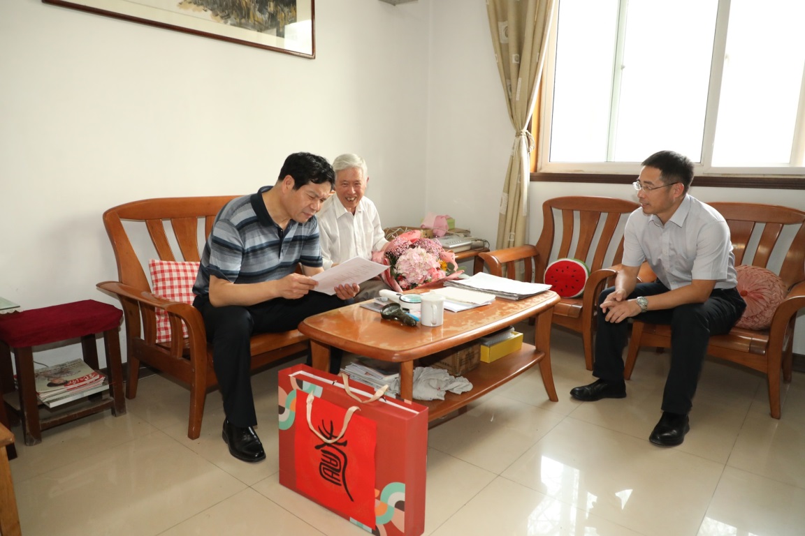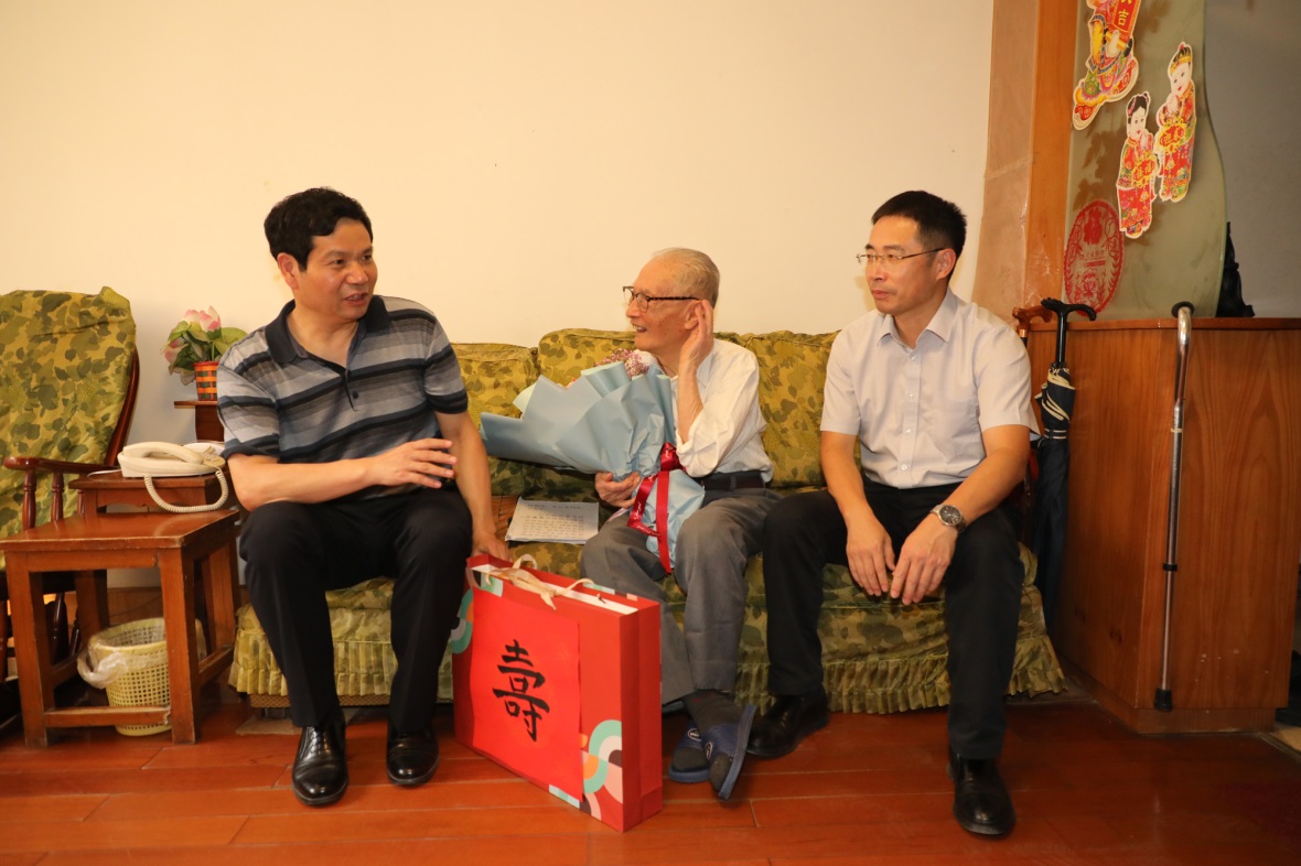 郑永安走进蒋老家中,向他送上鲜花和慰问品,并致以节日的祝福。郑永安与蒋老促膝而坐,亲切交谈,蒋老身体硬朗、精神矍铄,在谈到蒋老在学校举行的“庆祝中华人民共和国纪念章”颁发仪式上的发言时,郑永安再次表达了对蒋老的敬意和赞誉,并希望蒋老好好保重身体安享晚年。