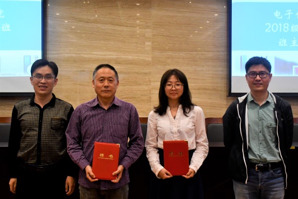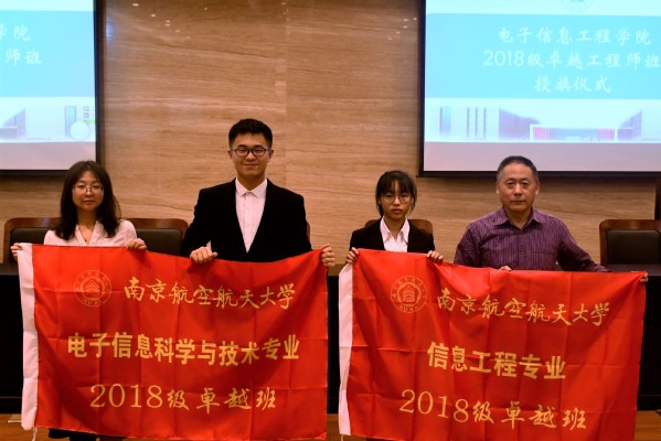 开班典礼最后,袁磊、洪峰为“卓越班”两位班主任颁发聘书,两位班主任分别为两个“卓越班”授旗,标志着电子信息工程学院2018级“卓越班”正式组建。