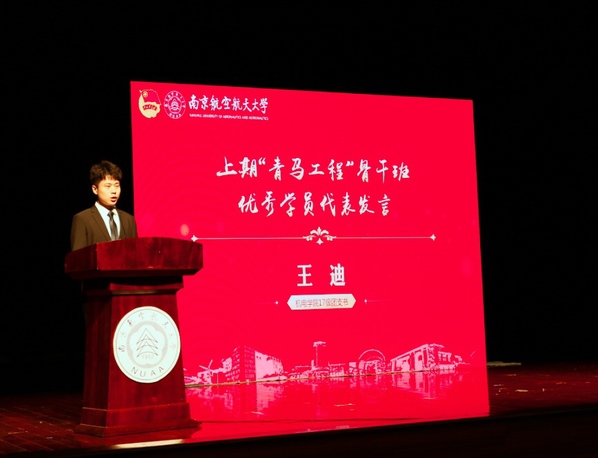 简短的国庆70周年阅兵式回顾视频后,活动正式开始。上期培训班优秀学员代表、机电学院2017级本科生王迪上台分享了自己参加理论学习和军工记忆实践的收获与感悟,并以“珍惜学习机会,带着问题学”与在场学员共勉。