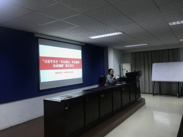 为深入贯彻落实习近平总书记在“不忘初心、牢记使命”主题教育工作会议上的重要讲话和《中共南京航空航天大学委员会关于开展“不忘初心、牢记使命”主题教育的实施方案》精神, 10月14日晚上,机电学院2017级本科生党支部在15号楼522报告厅展开集中学习,全体预备党员、发展对象和入党积极分子共75人参加,辅导员刘洪达主持会议。