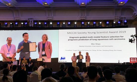在10月17日结束的2019年第22届医学图像计算和计算机辅助干预国际会议(The 22th Medical Image Computing Computer Assisted Intervention,MICCAI 2019)上,我校计算机科学技术学院/人工智能学院博士后邵伟在MICCAI正会上展示了他在联合基因影像数据进行预后预测上的研究工作,并凭借论文《Diagnosis-Guided Multi-modal Feature Selection for Prognosis Prediction of Lung Squamous Cell Carcinoma》一举斩获大会青年科学家奖(Young Scientist Award)。成为本次会议5位获奖者中唯一国内的青年科学家,其他四名获奖者分别来自美国约翰霍普金斯大学,美国梅奥诊所,法国巴黎综合理工大学等全球排名前50的科研或医疗机构。