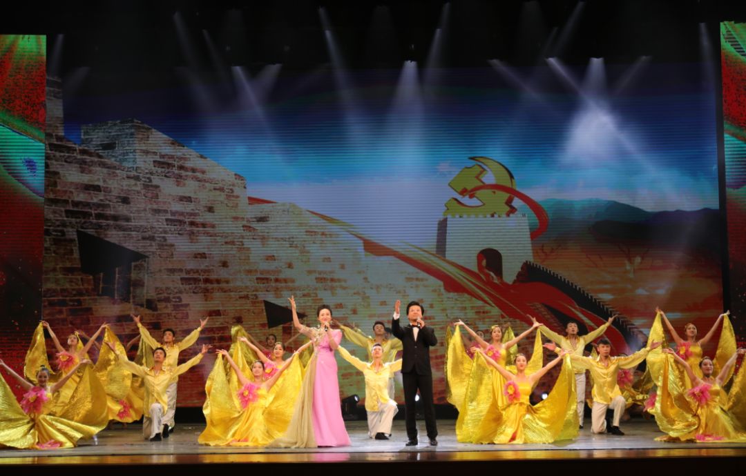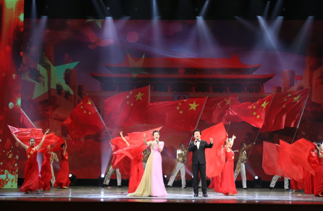 演出尾声,在《红旗飘飘》的歌声中,全体演员一起挥舞起手中的国旗,共同庆祝新中国70华诞。