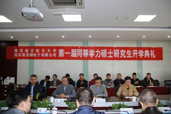 2019年10月26日,南京航空航天大学自动化学院-连云港杰瑞电子有限公司第一届同等学力硕士班开班典礼在连云港716所杰瑞电子公司报告厅举行。南京航空航天大学自动化学院院长江驹、副院长宋晓峰、教学办主任王俊彦以及理学院副院长王正盛,合作培养单位中船重工第七一六研究所人力资源部副主任戴竞、连云港杰瑞电子有限公司总经理颜耀、副总经理黄新吉、沈辉焱,连云港杰瑞自动化公司副总经理、党总支书记刘志成及多位部门经理、全体即将入学的研究生出席本次典礼。典礼由黄新吉副总经理主持。