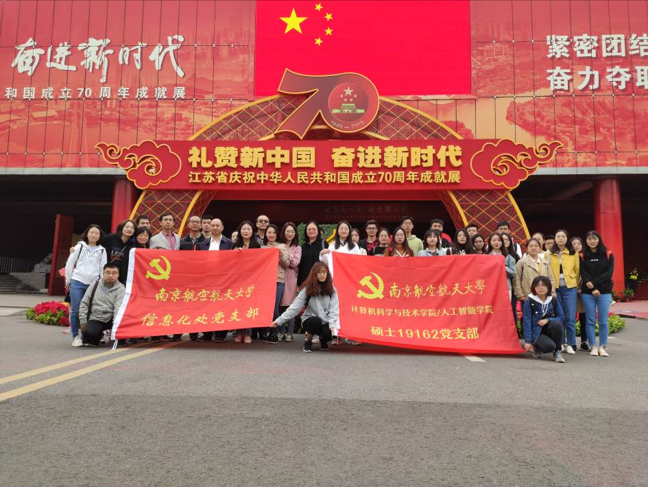 为庆祝新中国成立70周年,深入了解江苏发展的光辉历程和辉煌成就,结合“不忘初心、牢记使命”主题教育,10月27日下午,计算机科学与技术学院/人工智能学院硕士19162党支部与校信息化处党支部联合举办党日活动,参观江苏省庆祝中华人民共和国成立70周年成就展。