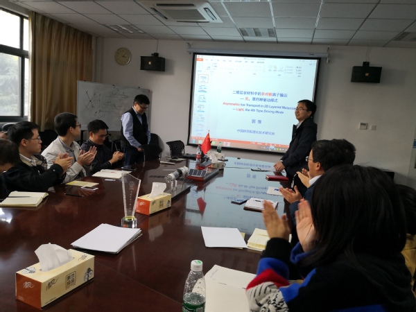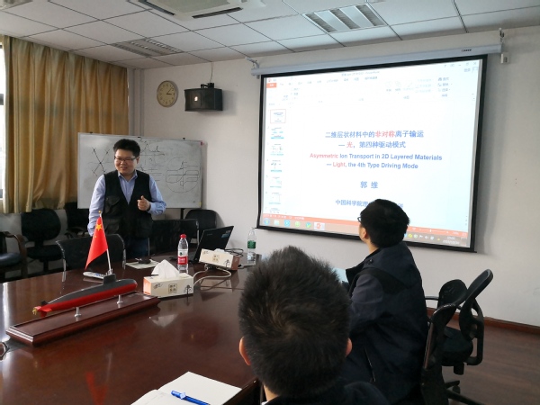 郭维介绍了非对称输运的常用驱动方式,报告了其课题组近年来在光驱动非对称离子输运体系的大量工作。报告内容不但具有学术深度和高度,还十分详实、生动,对我校相关科研工作具有重要借鉴意义。同时,郭维还结合自己多年的研究经历,与现场听众分享了他在仿生功能材料、界面物理化学、纳米流体、新型能源材料、二维材料等多学科领域的研究心得和体会。报告会由仇虎副研究员主持。会后,郭维与我校师生做了深入的交流和探讨及补充和解答。