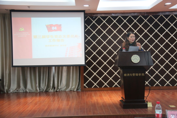 会上焦宏图宣读了《中共南京航空航天大学经济与管理学院委员会关于同意中共南京航空航天大学经济与管理学院学生党总支委员会换届选举请示的批复》。涂志宏代表学院上届学生党总支作了“不忘初心、砥砺前行,全力助推学院改革发展和学生成长成才”的工作报告,回顾了上一届学生党总支在新形势下扎实推进学生基层党建工作的相关成果,并强调需积极全面谋划下一届学生党总支的工作。