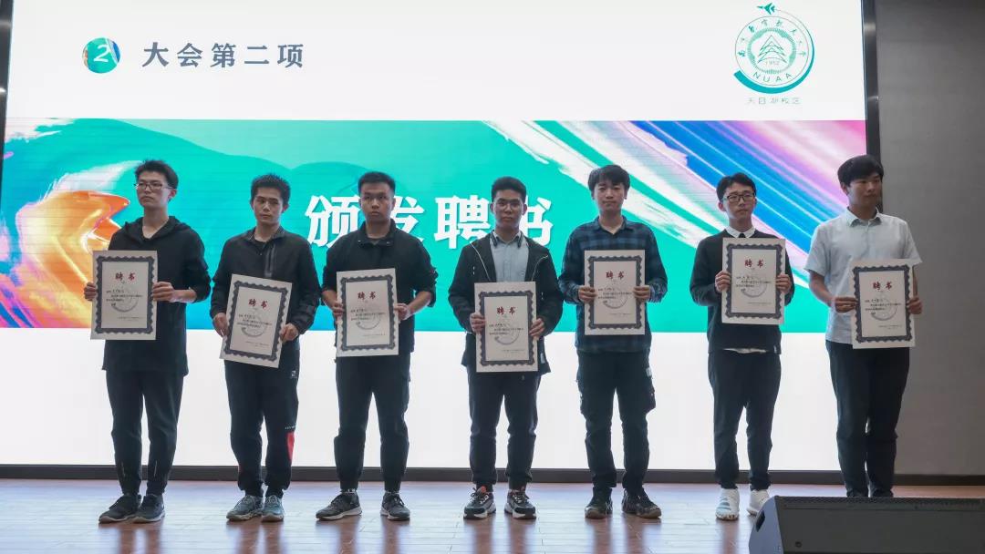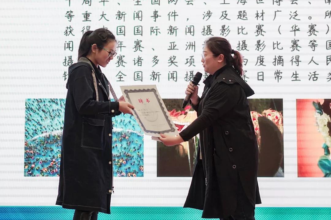 中国新闻社摄影记者泱波与我校艺术学院新闻传播学系党支部书记唐庆为万树潼等七位同学颁发部长聘书,天目湖校区管委会党政办主任、天目湖校区新闻社指导老师寇晓洁为肖宇涵同学颁发特别顾问聘书。
