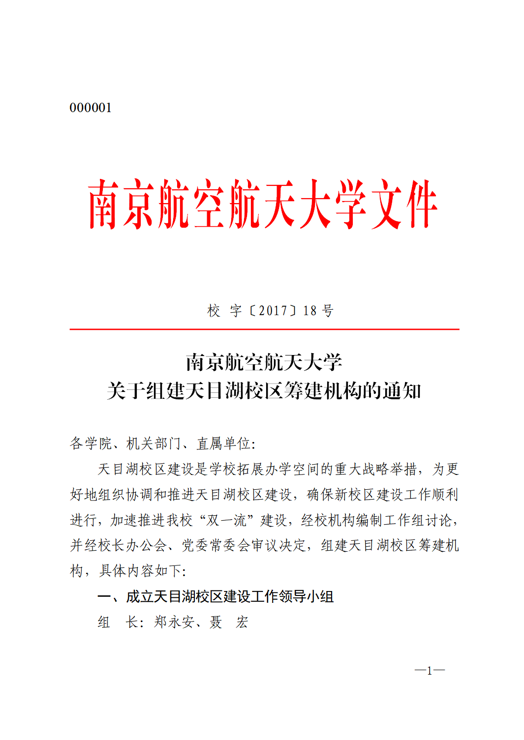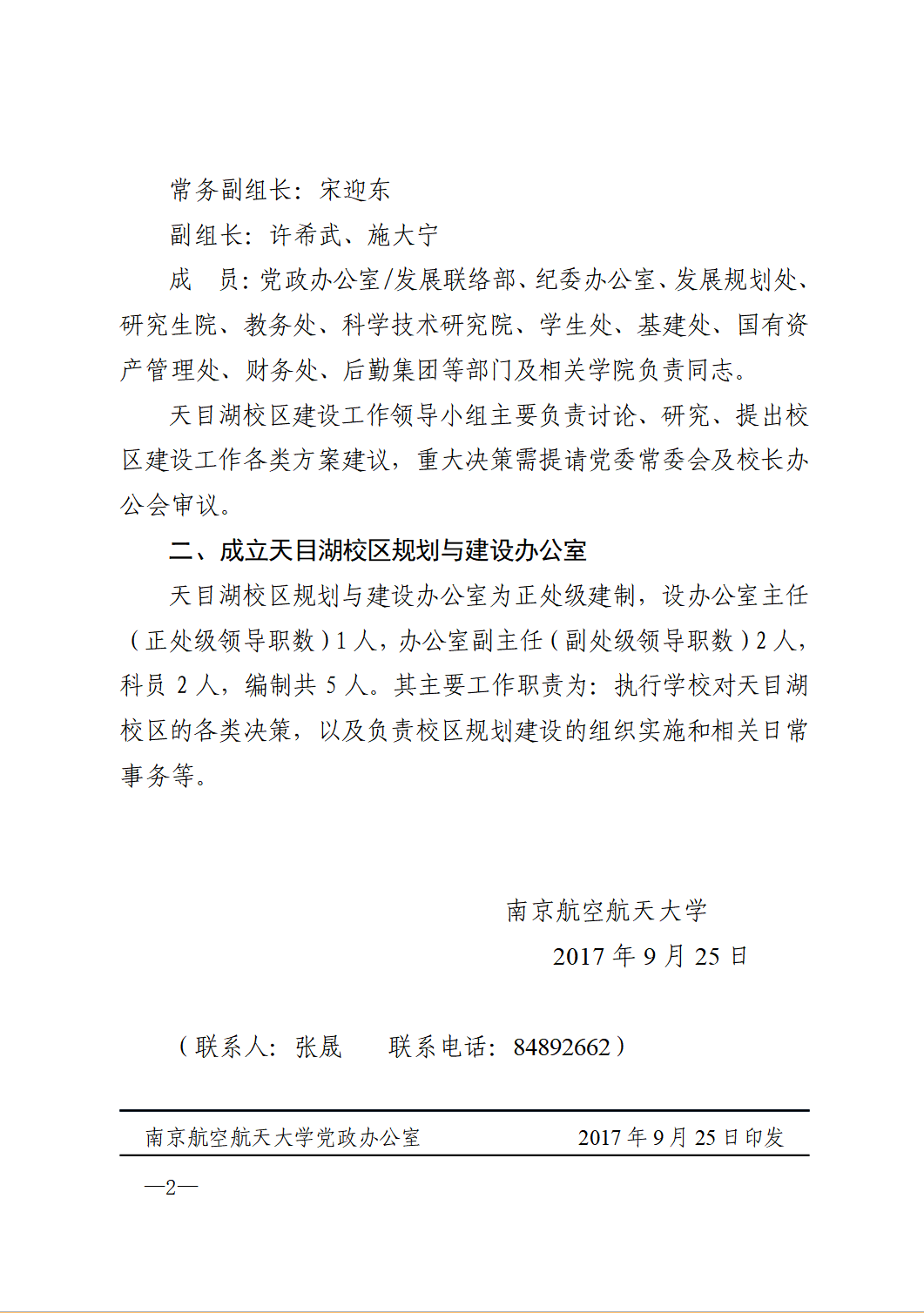 组建机构,确保建设。2017年9月25日,南航成立天目湖校区建设工作领导小组。领导小组由校党委书记郑永安、校长聂宏亲自挂帅担任组长。副校长宋迎东担任常务副组长,副校长许希武、施大宁担任副组长,各职能部处的主要负责同志担任组员,一个顶层重视、基层落实的体系全支撑强的领导体系正式建立。领导小组主要负责讨论、研究、提出校区建设工作各类方案建议。同时,成立天目湖校区规划与建设办公室,具体执行学校对天目湖校区的各类决策,以及负责校区规划建设的组织实施和相关日常事务等。