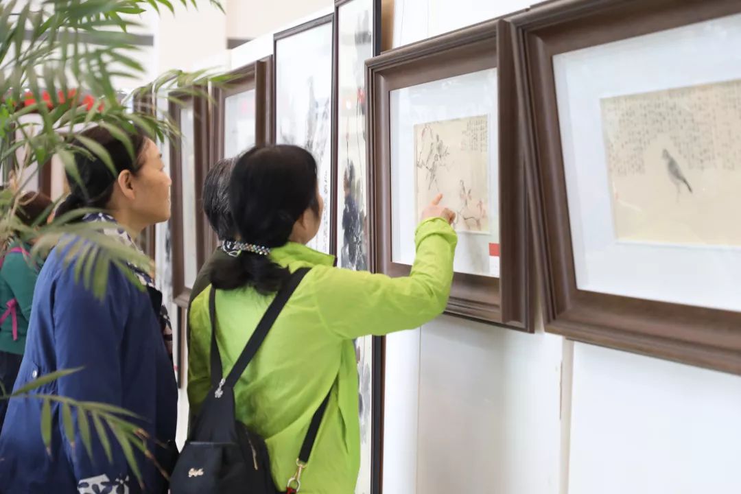 开幕式后,在场师生一同参观展览,展板前,几位退休老教师在一起笑容灿烂地在自己的作品前合影,她们都是南航老年书画研究会的会员,同时是参展作品的作者。其中杨聪英老师有两幅画作在馆内展出,谈起参与活动的感受,她说:“活动丰富了我们的老年生活,和朋友们在一起大家都非常开心。”