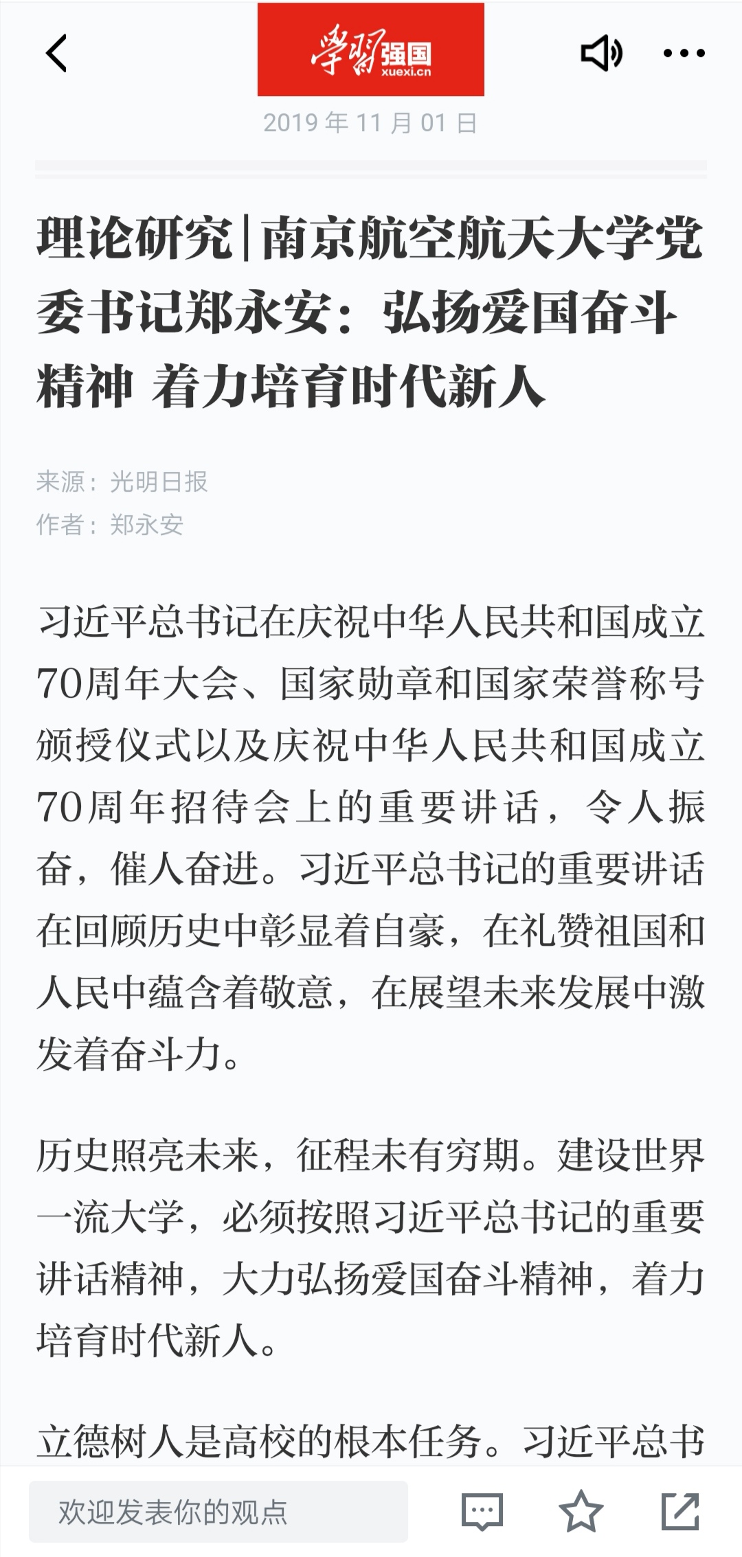 11月1日,“学习强国”平台发布我校党委书记郑永安在《光明日报》上的署名文章《弘扬爱国奋斗精神 着力培育时代新人》,文章从三个方面阐述了在“不忘初心、牢记使命”主题教育中的学习体会。现转发全文: