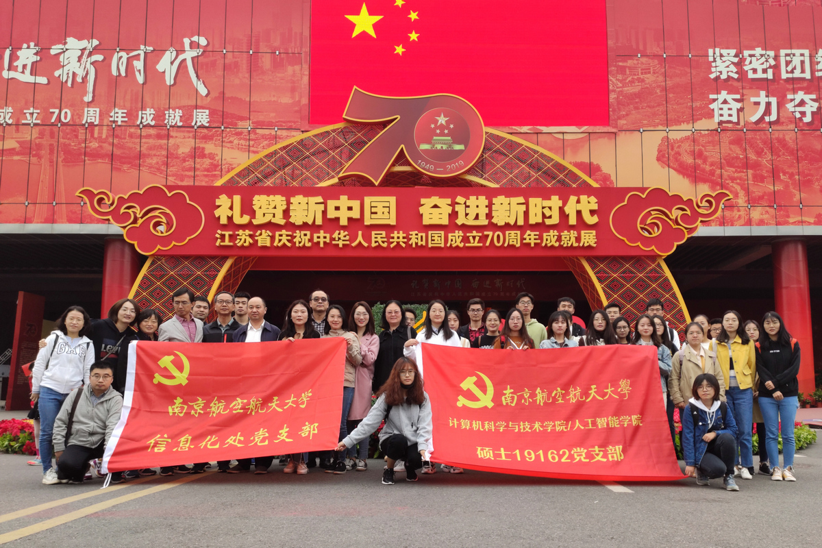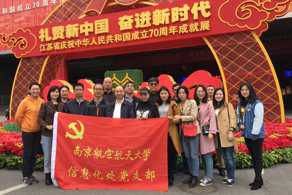 为深入贯彻落实“不忘初心、牢记使命”主题教育,2019年10月27日上午,信息化处党支部联合计算机科学与技术学院/人工智能学院硕士19162党支部前往南京国际博览中心参观“江苏省庆祝中华人民共和国成立70周年成就展”。