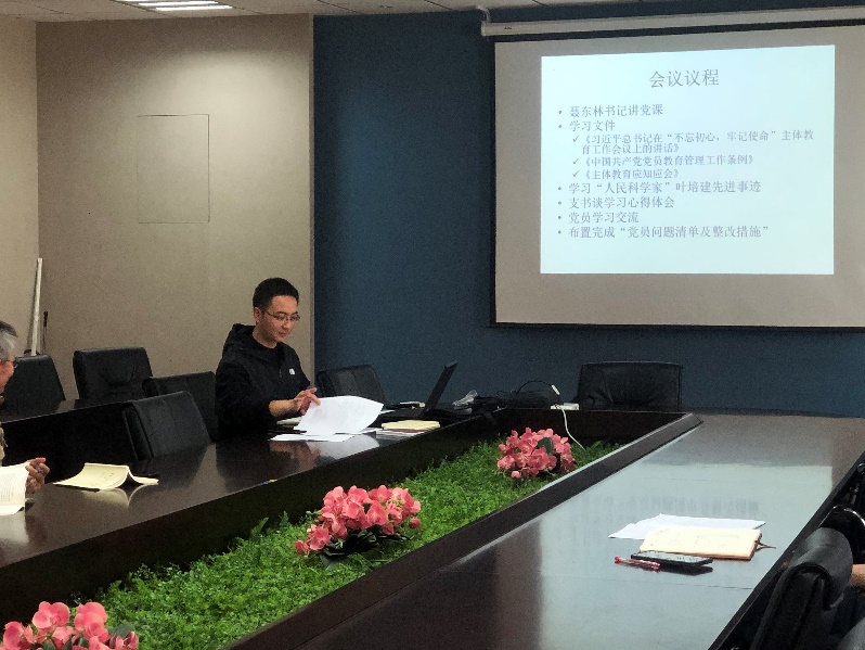 接着,支部副书记柳涛领学了《习近平总书记在“不忘初心,牢记使命”主题教育工作会议上的讲话》;宣读了《中国共产党党员教育管理工作条例》中党员日常教育管理方式,带领大家从组织制度上更为了解如何提高自己的组织纪律行;分享了自己学习《习近平关于“不忘初心,牢记使命”论述摘编》的心得体会,以“学高为师,德高为范”为标准,做品行之师、学问之师,做“四有”教师,指引学生知行合一,映照出学生成才之路。本次主题教育还根据学校党委下发《关于向“人民科学家”叶培建同志学习的决定》,对叶培建的先进事迹进行学习。会上指出要学习叶培建同志对党忠诚、坚守信仰的政治品格,革命理想高于天。要学习叶培建同志胸怀祖国、情系航天的爱国情怀。同为航天科研工作者中的一名,我们要发扬叶培建精神,在科研上能做到唯实创新、攻坚克难。同时,要学习叶培建同志淡泊名利、潜心育人的师德风范。作为教育工作者要能深入课堂、实验室、学生宿舍一线,也能带领学生和青年教师对学科建设、教学科研、专业设置、人才培养、重点实验室建设等进行深入探讨。