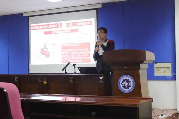 2017级本科生党支部书记刘洪达紧扣入党初心,从普遍的入党动机有哪些、如何端正入党动机、大学生党员的责任与使命等方面进行分享,旨在让学生党员了解中国共产党从哪里来,到哪里去,从而进一步明确自己的入党动机,承担起自己作为一名大学生党员的责任与使命。