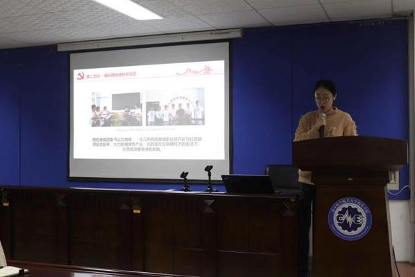 2017级本科生党支部党员骨干沈颖从党支部在西柏坡的暑期社会实践经历出发,向党员们诠释了西柏坡两个“务必”精神的内涵所在。除此之外,她结合在平山县的调研走访,向党员们展示了平山县武家庄脱贫的过程,突出国家扶贫成果,增强党员组织认同感。