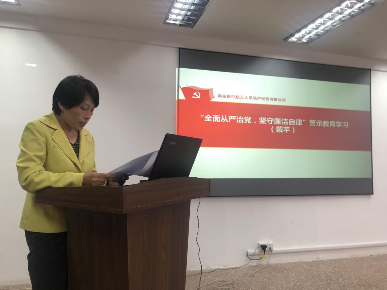 10月25日,支部纪检委员、资产经营公司副总经理戴芊同志以“全面从严治党,坚守廉洁自律“为主题上廉洁警示教育党课。她首先传达了学校警示教育大会精神,然后通报了中纪委、教育部近年来查办的高校系统以及我校近年党员干部违反政治纪律、违反中央八项规定精神、违反组织纪律、违反廉洁纪律、违反工作纪律、违反生活纪律的典型案例,深刻剖析案件特点和原因,以此警醒党员同志们要提高思想认识,增强守纪律、讲规矩意识,加强理论学习,将纪律与规矩内化于心,外化于行。