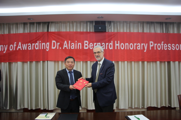 随后,张卓代表学校为Alain Bernard教授颁发荣誉教授证书,并为其佩戴校徽。