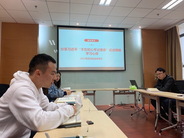 接着,全体党员针对《习近平“不忘初心,牢记使命”论述摘编》的学习心得进行分享交流,大家从“理性爱国”“学风建设”“学生干部的初心使命”等角度切入,与支部成员一起积极讨论,互相学习,检视问题,对标找差,整改落实。党支部书记康冲指出,老一辈党员是自己有一条被子也要割下一半送给老百姓的人,作为新时代的青年党员,要在同学中发挥模范带头作用,将党员的先进性落实于日常生活。