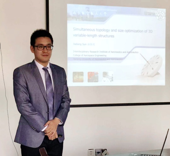 南京航空航天大学航空学院航空航天交叉研究院(IRIAA)孙加亮博士于2019年11月21日为我校师生做了题为“Simultaneoustopology and size optimization of 3D variable-length structures”的学术报告。