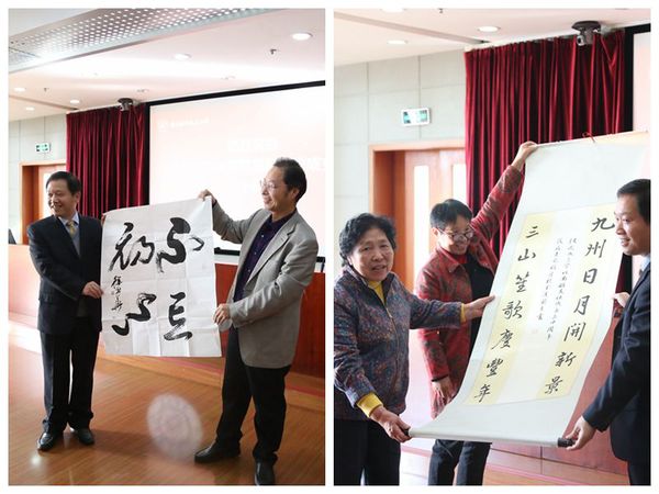 九三学社南京理工大学支社主委徐光华和九三学社社员敖国秀向委员会赠送书法作品。