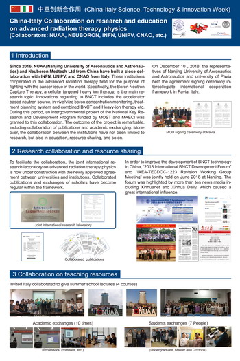 从2015年起,我校材料科学与技术学院核科学与技术系与意大利国家核物理研究院、意大利帕维亚大学开展科学研究、人才培养方面的国际合作。2016年,我校联合意大利合作单位申报获批了国家重点研发计划政府间国际科技创新合作重点专项——加速器硼中子俘获癌症治疗超热中子束设计与剂量优化。该项目多次得到中意两国外交、科技部门的关注,寄希望该项目成果能成为“一带一路”计划中意合作的实质性标志成果。2018年12月我校与意大利帕维亚大学签署了校际合作框架协议;2019年10月又签署了两校共同成立“先进放射治疗物理国际合作联合实验室”协议。