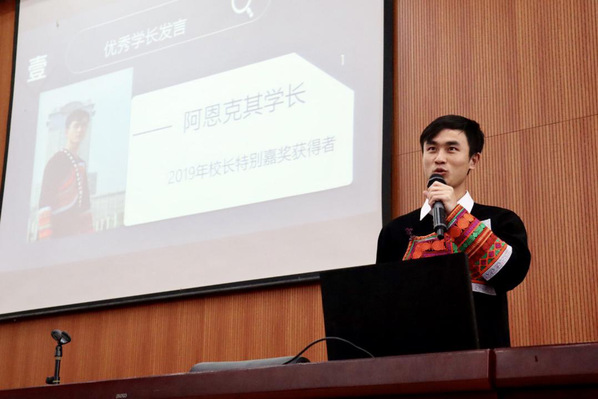为发挥高年级优秀同学的示范榜样作用,校长特别嘉奖之励志奖获得者2017级本科生阿恩克其受邀到场从“励志笃学”“适应环境”“志愿服务”三个方面分享了他的成长故事,他建议大一学弟学妹们尽快明确学习方向、充实大学生活,成为一名德智体美劳全面发展的经管学子。