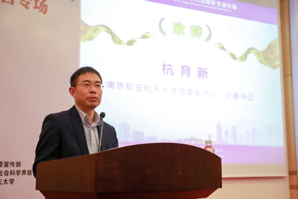 开幕式上,杭育新代表学校对省社科学术大会青年学者专场的举办表示热烈的祝贺。他指出,本次青年学者专场的举办,对于动员和引导全省哲学社会科学工作者尤其是青年工作者,进一步学习贯彻习近平新时代中国特色社会主义思想,开展“强富美高”新江苏建设,提供了强大的理论支撑和智力支持,具有十分重要的意义。杭育新表示,学校长期以来高度重视哲学社会科学的研究,立足三航特色,推动哲学社会科学与理工科的交叉融合,形成了一批高水平的研究成果。今后南航将继续坚持和巩固马克思主义在哲学社会科学领域的指导地位,面向国际学术前沿、立足南航自身实际,围绕立德树人根本任务,不断打造学科特色、学术平台和高水平师资队伍与研究队伍,不断提高南航育人质量、创新能力和服务国家、服务社会的水平。