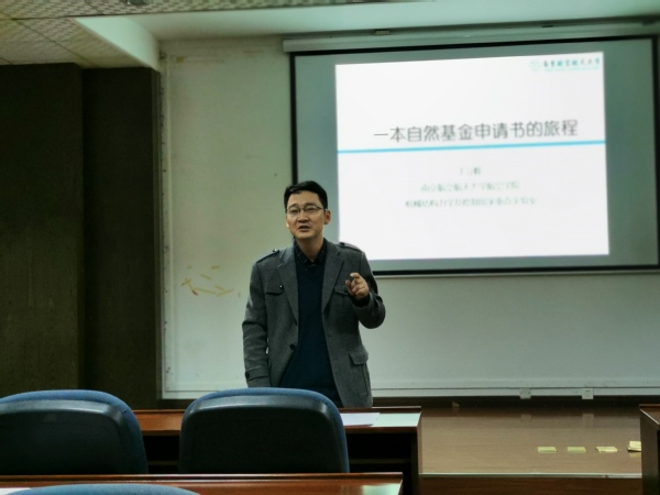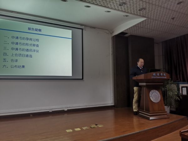 王立峰作了题为“一本自然基金申请书的旅程”的辅导报告,内容包括选题、搜集整理资料、凝练研究内容、撰写申请书、同行提意见建议、修改完善、形式审查、专家预评审等内容。