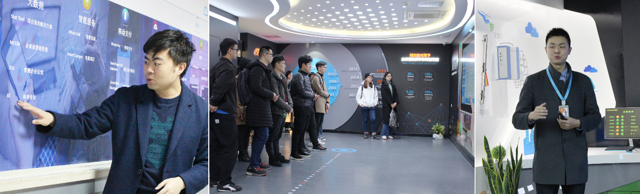 在公司人力资源负责人潘夏力的带领下,计算机学院师生一行首先参观了浩鲸云计算科技股份有限公司的国际业务运营中心BG3部门、云智能展厅和运营商展厅。通过实地参观、聆听讲解、现场观摩,学生对企业有了更为直观的认知,也对专业的具体应用有了更深的理解。