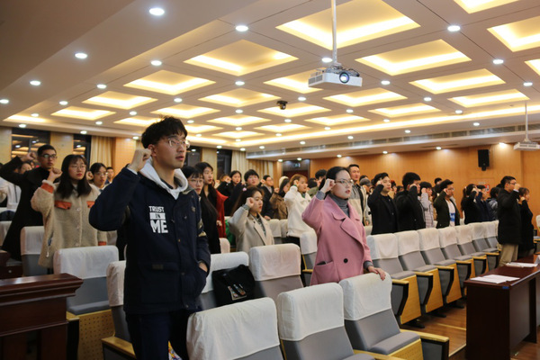 最后,由高志宏领誓,十二位学生代表手持中华人民共和国宪法宣誓本站在前列,全体成员起立庄严宣誓:“我宣誓:忠于中华人民共和国宪法,维护宪法权威,履行法定职责,忠于祖国,忠于人民,恪尽职守、廉洁奉公,接受人民监督,为建设富强民主文明和谐美丽的社会主义现代化强国努力奋斗!”