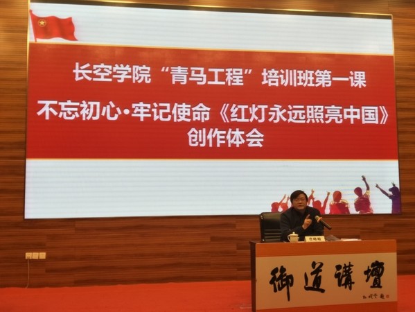 12月11日下午,我校第90期御道讲坛于一号楼四楼报告厅举行。著名作家、记者、编导、资深媒体人曹峰峻应邀来校,为南航学子带来了一场主题为“不忘初心·牢记使命《红灯永远照亮中国——吴振鹏烈士传》创作体会”的讲座。长空学院常务副院长蒋彦龙、党政办主任付亮、学生工作办公室主任夏昌青及200余名学生骨干共同参加了本次讲座。活动由夏昌青主持。