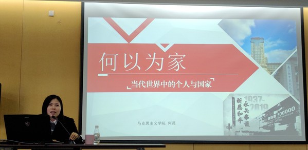 何畏通过分享影片《何以为家》, 介绍汉字中“家”与“国”的演变过程及展示南京老城照片,向学生阐释国与家的关系。同时,何畏围绕习近平总书记在纪念五四运动100周年大会上的讲话中 “个人的命运与国家的命运相连,小我融入大我”的内容指出,人民群众是历史的推动者,中国发展到今天,不仅在于那些有名有姓的英雄,还在于整个民族涌现出了无数的无名英雄为之奉献和奋斗。也正是无数的无名英雄铸就了如今的中华民族,如今强盛的中国,这就是小我融入大我的最好阐释。