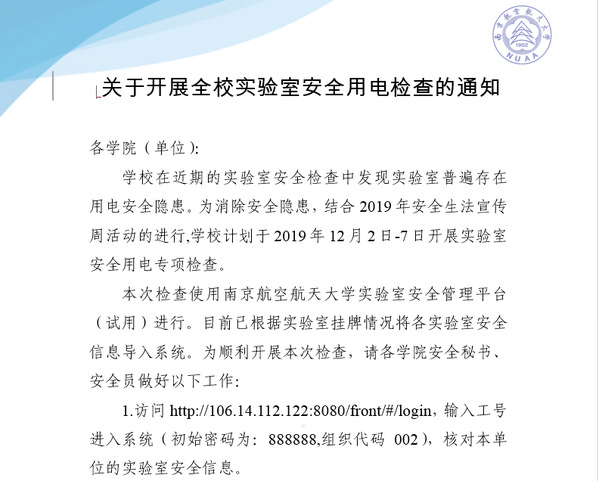 结合安全法宣传周,我校还开展了实验室安全用电专项检查,并上线隐患排查信息系统,以促进工作高效化、科学化、专业化开展。本次检查借助南京航空航天大学实验室安全管理平台,重点检查实验室是否存在电线私拉乱接、接线板串联、电线裸露、电源插座位置不合理、配电箱插座配备与实际使用要求不匹配,遮挡配电箱,未张贴用电警示标识等现象,以便发现隐患及时整改。