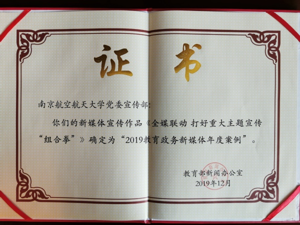 2019年12月18日至19日,2020教育政务新媒体年会在东北林业大学召开,教育部新闻办主任、办公厅巡视员续梅在会上讲话,中国教育学会常务副会长刘堂江致辞。会上发布了2019教育政务新媒体年度案例,全国共有30所高校入选,我校选送的《全媒联动 打好重大主题宣传“组合拳”》入选“2019教育政务新媒体年度案例”,是工信部部属高校唯一入选案例。