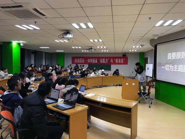 张世俊以“说服力”为关键词,就如何提高PPT制作技巧向在场学生骨干传授了经验。他首先简要介绍了PPT制作的基本知识,随后,他分别从字体、线条、背景、颜色、动画制作等几个方面,详细地为在场学生讲述了PTT制作过程中应该注意的问题。他通过理论讲授和实际操作,将自己几年来积累的心得体验分享给大家,让学生骨干们学到了很多理论知识和实操技巧。
