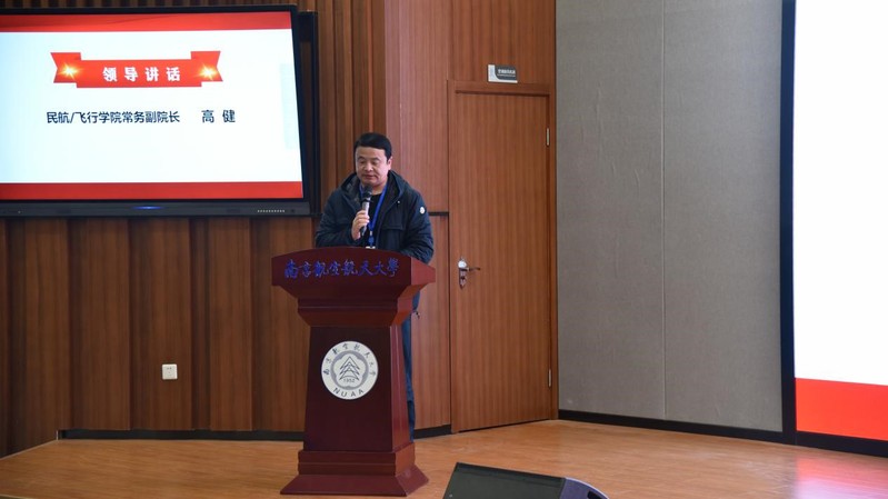 高健首先致辞,他代表民航/飞行学院向前来参加活动的领导嘉宾和同学们表示热烈的欢迎,向长期关心和支持学院的领导和老师表示衷心的感谢!他表示面对新时期民航强国的战略需求,学院加强培养拔尖民航人才,实施民航教育创新工程,全面提升学院本科教学质量。他还勉励同学们要努力掌握正确的科研方法,树立严谨的治学态度,不断提升自己的学术能力和素养。