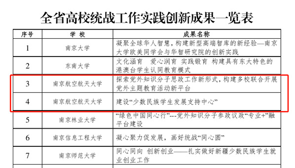 近日,江苏省教育厅公布了全省高校统战工作实践创新成果获奖名单。我校选报的“探索党外知识分子思政工作新形式,构建多校联合开展党外主题教育活动新平台”“建设‘少数民族学生发展支持中心’”2个项目获2019年度全省高校统战工作理论创新研究成果。