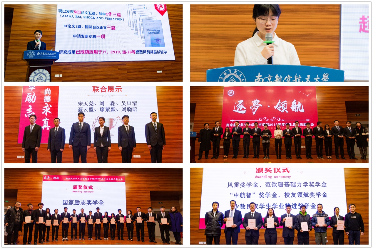 航空青年要求真,修身立德,明辨是非,匠心逐梦;要励志,学深悟透,真信笃行,扬帆领航。国家奖学金获得者、2017级研究生戴雨可分享了自己的科研求真之路,年度特别嘉奖之笃学奖获得者聂连瑞则介绍了自己小女子、大担当的成长轨迹。7名同学代表他们的团队展示了一年来参与第十五届国际大学生工程力学竞赛、SAE国际航空设计大赛、2018中国国际飞行器设计挑战赛、周培源力学竞赛、中国大学生物理学术竞赛、研究生未来飞行器大赛等国内外重量级竞赛并获得各类荣誉的事迹,以赛促学、学以致用,航空学子一直在路上。随后,大会颁发了国家奖学金、国家励志奖学金、园丁励志奖学金、少数民族学生学业精进奖学金、特别奖学金。