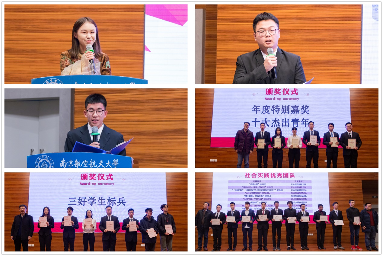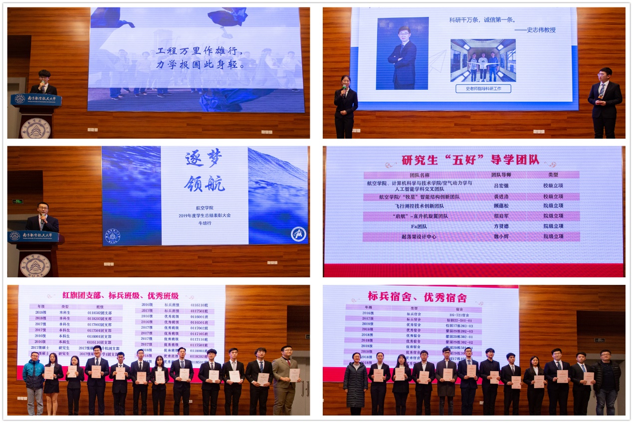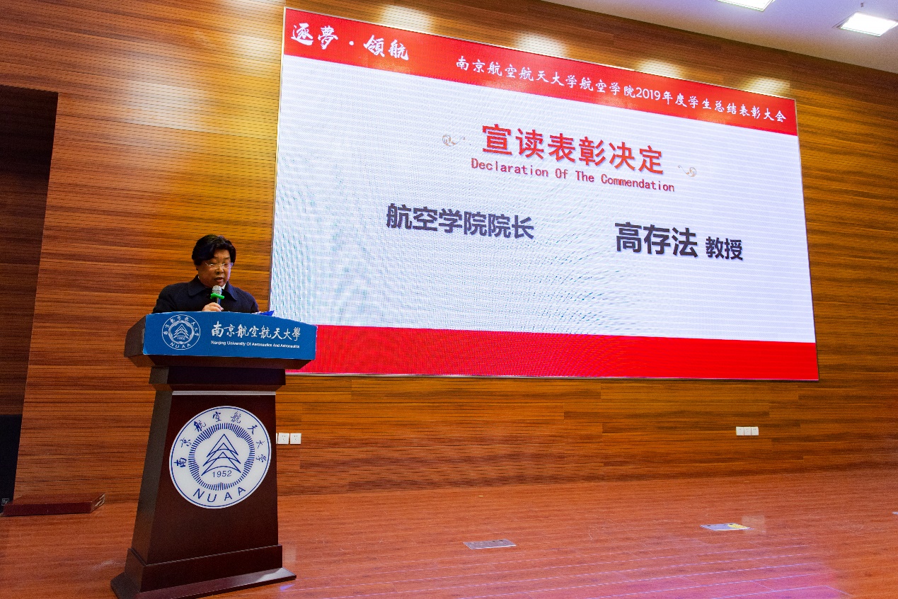 0117502团支部原创诗朗诵《我的国》拉开了大会序幕,高存法宣读了《南京航空航天大学航空学院关于表彰2019年度先进个人及先进集体的决定》。2019年,是航空学子收获与成长的一年,在学院全体师生共同努力下,航空学子勤于学习、善于创造、勇于担当、甘于奉献,涌现了一批优秀个人和先进集体。