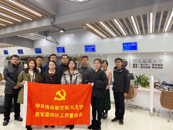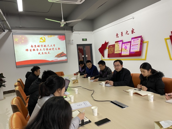 1月3日,南京航空航天大学师生服务大厅临时党支部成立仪式在将军路校区师生服务大厅会议室举行。将军路校区党工委书记石勇、将军路校区管委会副主任刘兼唐、党政办公室副主任张焱、将军路校区管委会党政办公室主任张建辉,相关部门进驻师生服务大厅的所有党员参加了本次成立仪式,仪式由张焱主持。