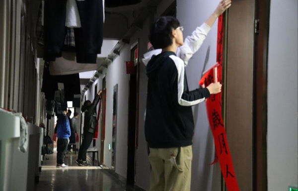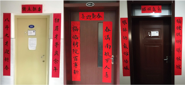 1月4日晚,全年级各寝室都将自己创作的对联张贴起来,19级辅导员张进鹏也来到现场祝同学们新年快乐。慧园二栋、怡园十八栋的寝室,瞬间被红彤彤的对联点缀得温馨无比,充满了浓浓的年味。除此之外,中心组的同学们还为各班班主任和学院办公室都准备了一副对联。由自己创作并书写的对联包含着我们材院学子在新年中对老师们深切的感恩与祝福。