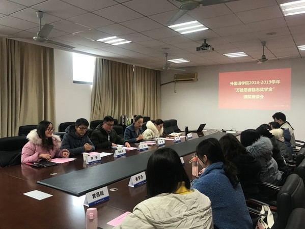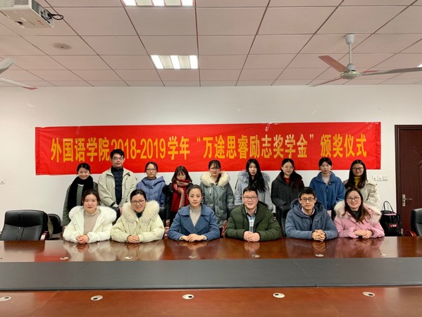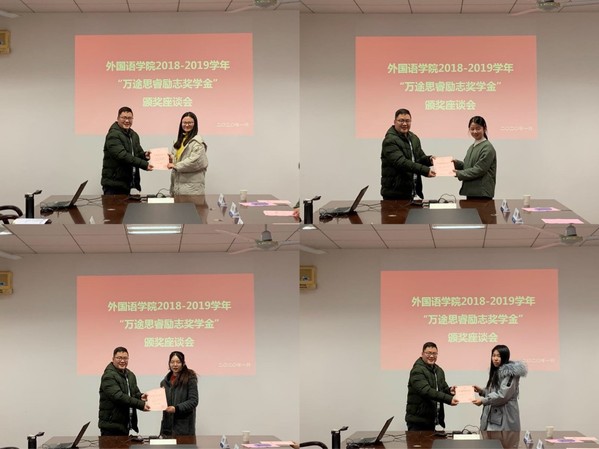 1月8日,外国语学院 2018-2019学年“万途思睿励志奖学金”颁奖仪式在学院322会议室举行。学院06届毕业生、万途思睿教育创始人丁亮及工作人员,外国语学院党委副书记梁薇及辅导员,获奖本科生、研究生参加了颁奖仪式。