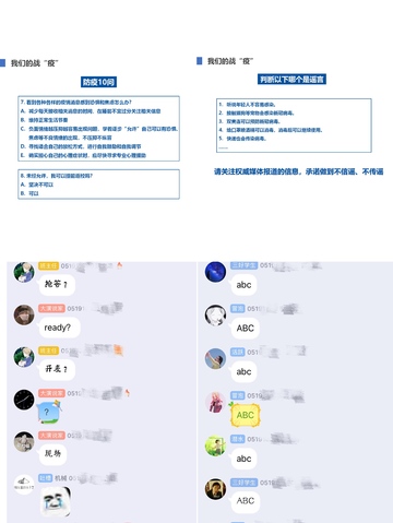 结合前期江苏省教育厅疫情防控线上专题培训的内容,通过“防疫10问”和“谣言粉碎机”两个环节,采用线上提问和QQ群抢答的方式向同学们普及防疫知识和学校日常管理政策,引导同学们关注身体和心理健康,加强体育锻炼,不信谣、不传谣,做好居家防护工作,相信科学、相信政府、相信学校。