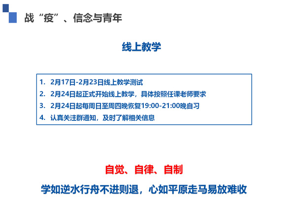 按照学校“延期开学、线上教学,创新模式、保证质量”的工作方针,线上教学将于2月24日正式开始。为了确保同学们如期上课,保持良好的学习秩序,通过上学期期末成绩分析和线上教学问题解答,强调了线上教学期间居家学习的纪律和要求,配合做好线上教学实际困难统计工作,引导同学们做好学习计划、制定学习目标,提高学习效率。