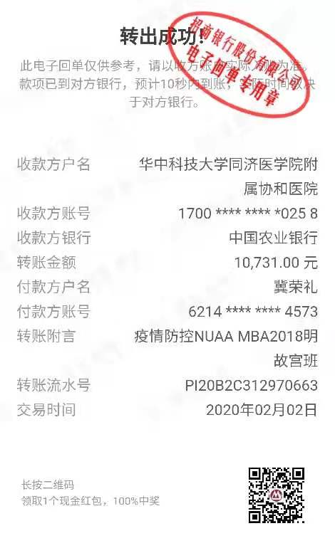 “一方有难,八方支援”,我们MBAers大多数人没法儿到救援的第一线,但内心一直关心着疫区情况,牵挂着正与病毒作斗争的逆行者们。南航18MBA明故宫班班委会在班级群里提出爱心捐款的倡议,希望将结余的班费捐赠疫区医院,献上绵薄之力。没想到刚刚在群里号召,便一呼百应,大家纷纷刷屏表示愿意将班费全部捐出。这笔班费虽然不多,但满载我们的热忱善心。正是有千千万万像南航MBAers这样善良、热心的同胞,祖国才能一直坚挺,不畏疫情。