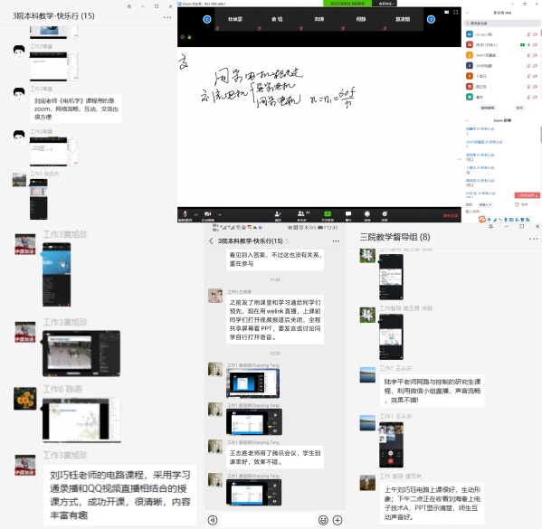 任课老师们课后积极进行经验分享和交流。王晓琳副院长作为任课教师也及时分享了在课堂中采用腾讯文档在线答题的方式和效果,以及在welink直播授课的效果呈现,互动过程很有效。电工技术中心刘巧珏老师课后第一时间分享了QQ群直播与学习通相结合的线上教学实施过程,。学院教学办及时将有关反馈转发所有任课老师,互相学习提高,确保教学的顺利开展。